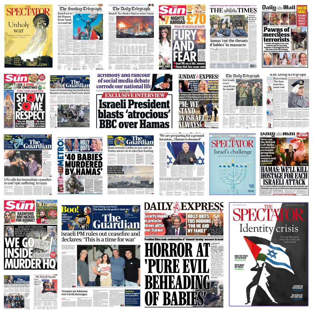 - Media-media Inggris seperti Daily Express, Daily Mail, Daily Telegraph, menyebut aksi-aksi demonstrasi pro-Palestina di London sebagai “hate marches”. Selain itu, Daily Express, The Times, Daily Telegraph, Metro, mempublikasikan di headline yang menyebut Hamas memenggal kepala bayi dan memiliki ruangan rahasia di bawah rumah sakit, klaim yang banyak dibantah bahkan oleh media Israel sendiri seperti Haaretz.