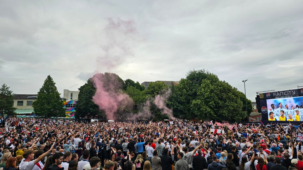 Namun, ketika scrolling di Instagram, saya menemukan postingan Fanzone UK. Mereka akan memasang layar besar dan mengadakan nonton bareng di Devonshire Green, taman yang hanya berjarak kurang dari lima menit jalan kaki dari flat saya. Selama sebulan penuh, Devonshire Green ditutup dan dikelilingi dengan pagar besi temporer dan kain hitam.